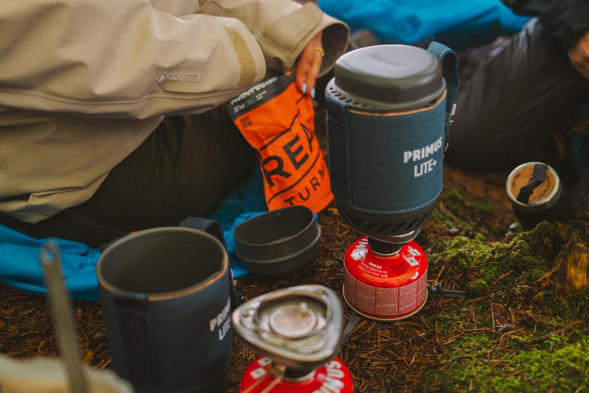 Kurz vor dem Gipfel richteten wir uns im Wald ein provisorisches Camp unter der Tarp ein und probierten unser erstes Asian Curry von Real Turmat mit dem Primus Lite Plus Kocher. Wer die vorgeschlagene Wartezeit einhält, genießt ein wirklich schmackhaftes Mahl – sonst wird es etwas zäh zu kauen;)