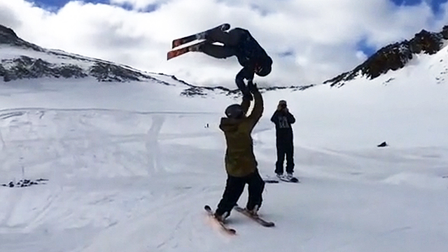 Freestyle Ski-Pro Johan Berg fliegt über den Kicker und klatscht auch noch beim Kumpel ab