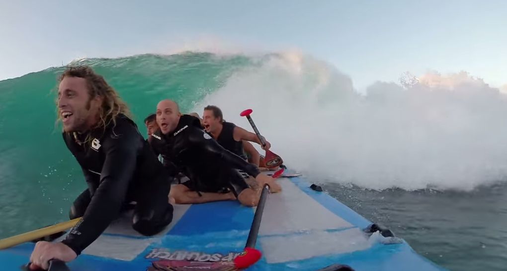 Freesurfer Jamie O'Brien und seine Jungs mit der Testfahrt auf dem Riesen-SUP in Waimea