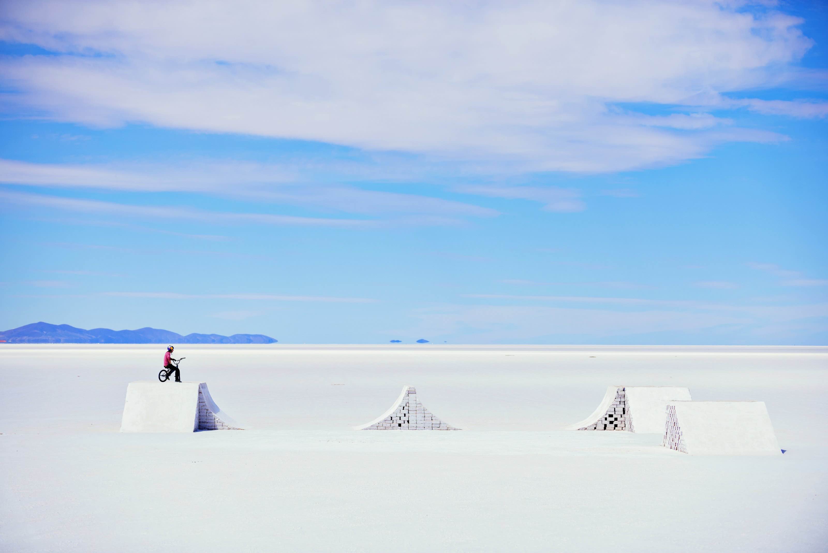 Der Rider aus Caracas baut sich auf der größten Salzpfanne der Erde Rampen aus Salz