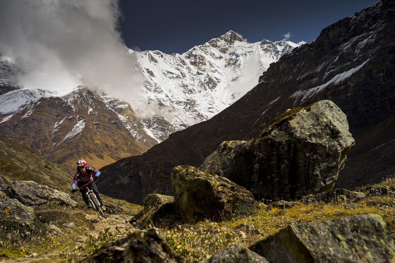 Ich teile dieses Erlebnis mit der ehemaligen Downhill-Weltmeisterin Tracy Moseley und ihrem Partner und Techniker James Richards, den erfahrenen Bike-Guides Phil und Lucy aus Verbier sowie ihrem Kumpel Christer. Unsere Aufregung ist groß, und wir teilen in dieser gewaltigen bergigen Umgebung neue Erfahrungen. Bei uns ist auch ein indischer Mountainbiker und Filmer: Vinay Menon staubt uns bei allen Abfahrten ein, am Ende klagt er aber immer über einen Reifenschaden.