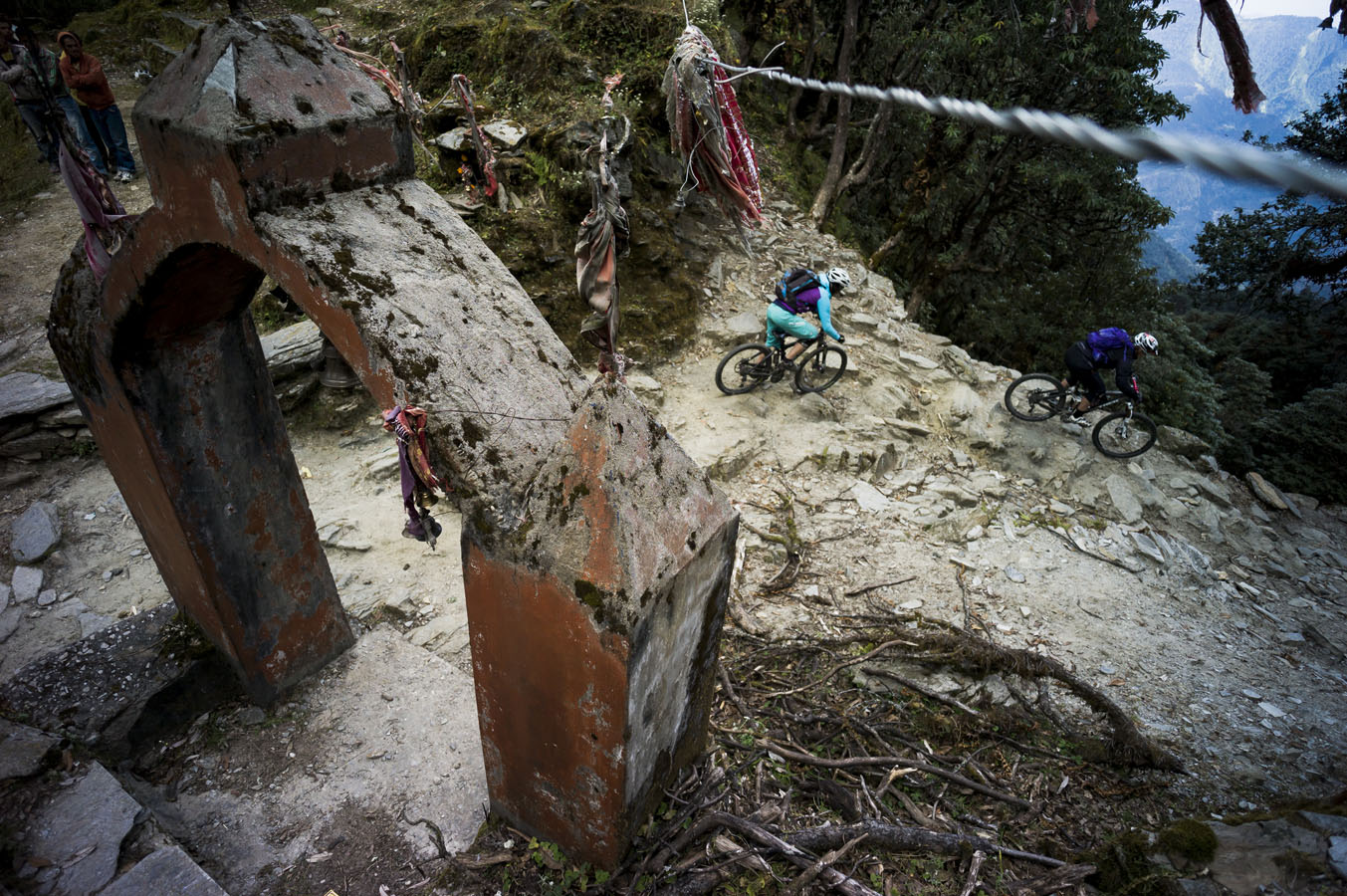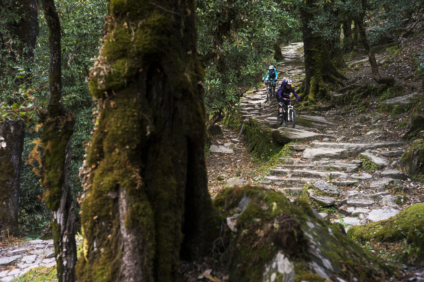 Wir sind uns der gewaltigen Anstiege und den Höhenmetern, die wir bewältigen müssen, bewusst. Auch wenn diese ersten Tage sich als anstrengend erweisen, sind wir dankbar, uns akklimatisieren zu können. Zum Glück liegt Nainital nur auf 2000 Metern. Die Belohnung dieser frühen Anstiege sind die Abfahrten, in denen man durch dichten Wald und durch Felsgärten flowt, die alle mit einem grünen Moosteppich überzogen sind. Mike McLean hat seine Hausaufgaben gemacht. Sorgfältig hat er die Routen für jeden Tag kalkuliert und mehr Abfahrten als Anstiege integriert. Es soll sich keiner beschweren können. Trotz seines gut recherchierten Punkt-zu-Punkt-Routenplans und der Hilfe von klappernden Jeeps, um uns von den Endpunkten zu den Hotels zu bringen, treten wir täglich einen vertikalen Kilometer. Die Hoffnung, dass der Pindari-Gletscher ein einfacher Shuttle-Trip wird, kann man also getrost verwerfen. Hier werden Gravitationspunkte hart verdient.