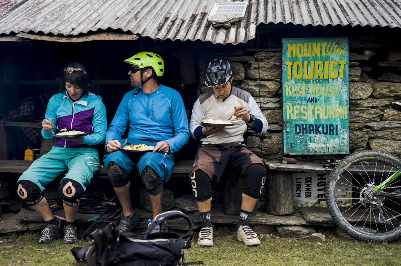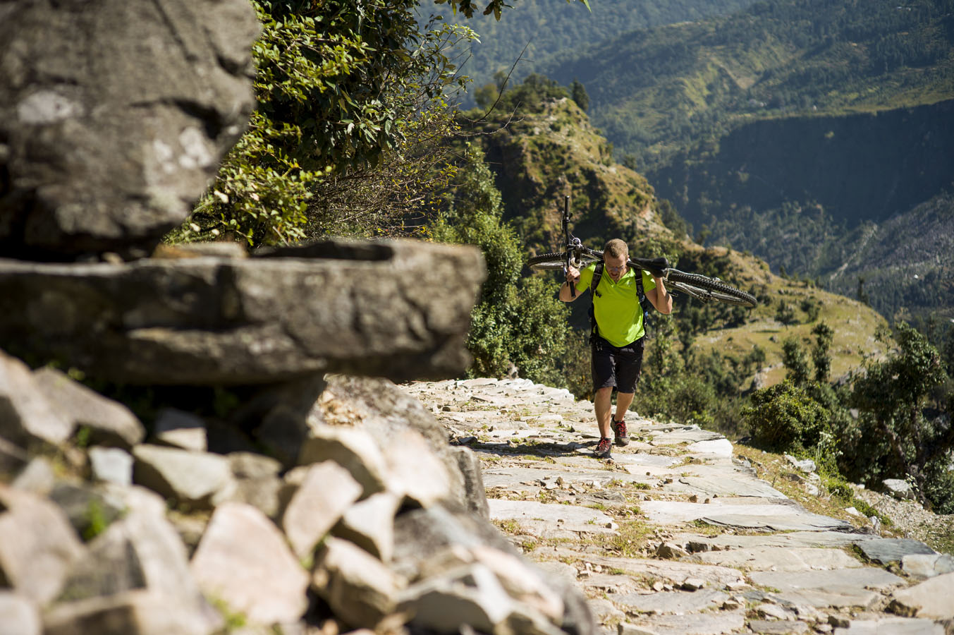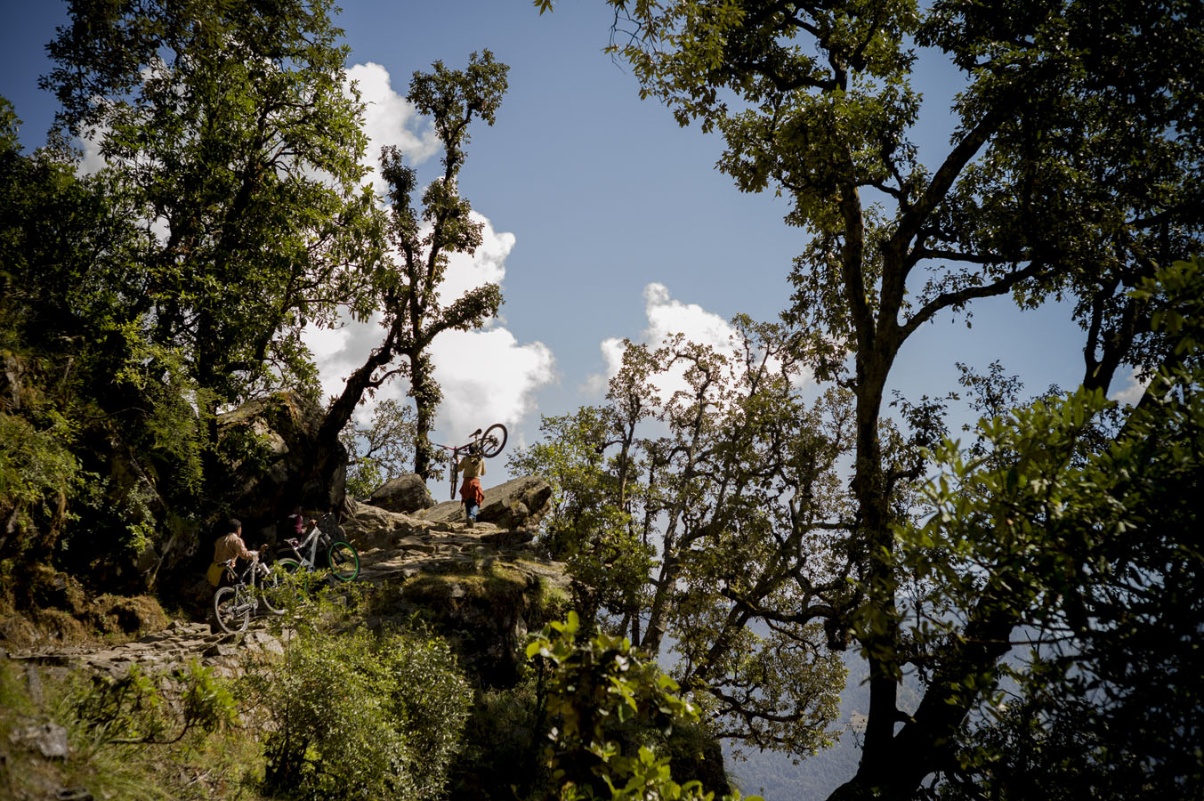 Zwischen unserem Ziel und uns liegt der 2940 Meter hohe Dhakuri-Pass. Der Zugang zu diesem steilen asphaltierten Weg ist nicht befahrbar, als einziger Teil des zwölftägigen Trips. Mike zieht ein Ass aus dem Ärmel: Träger. Der Plan eines Aliens? Jemanden zu bezahlen, der mein Bike tragen soll? Schnell erwärme ich mich für die Idee, indem ich mir vorstelle wie mein „Reichtum“ an die lokalen Dorfbewohner übergeht. Für sieben Euro pro Kopf werden die Bikes den Pass hochgehievt. Nur Mike, Vinay und Pankraj tragen ihre Bikes selbst.