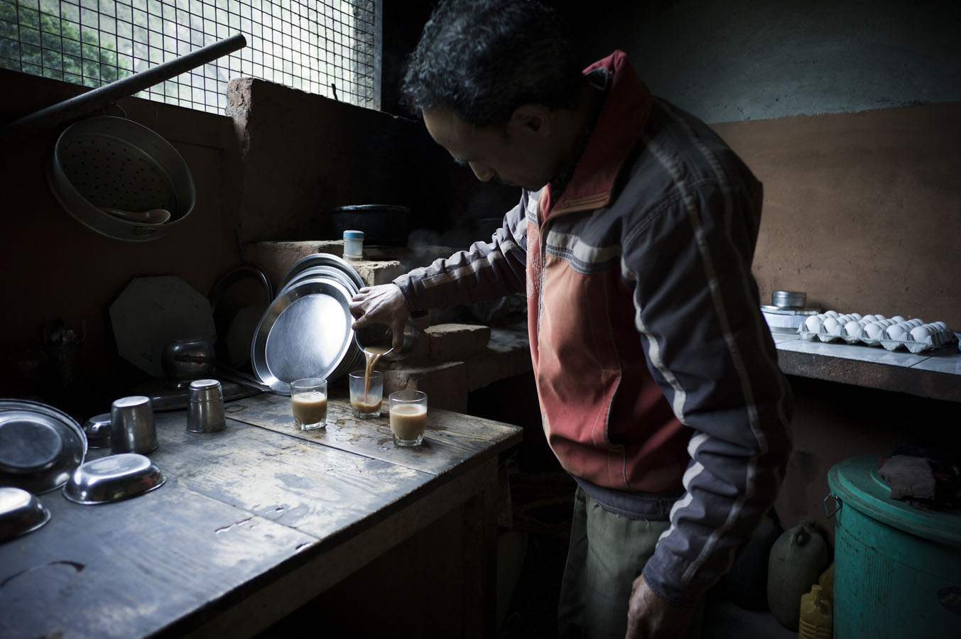 Die Geräusche von Wasserfällen begleiten uns auf der ganzen Reise. In der Region Uttrakhand liegt das großartige Abwasser-Netzwerk des Himalaya, welches schließlich zum heiligen Ganges wird, dem Fokus tausender Gläubiger. Irgendwie veranstalten wir unserer eigene bescheidene Pilgerreise, unsere zu einer alternativen Quelle des gleichen heiligen Flusses. Nur sind wir hier mit neun Personen unterwegs. Die Jeeps lassen uns an einem Teehaus aussteigen, wo wir unzählige Gläser von milchhaltigem Chai trinken. Wir warten auf unsere Lasttier-Support-Crew, aber sie sind zu spät. Das bedeutet, dass wir nach dem fünfstündigen und 1600 Höhenmeter langen Aufstieg, der vor uns liegt, in der Dunkelheit in Khati ankommen werden.