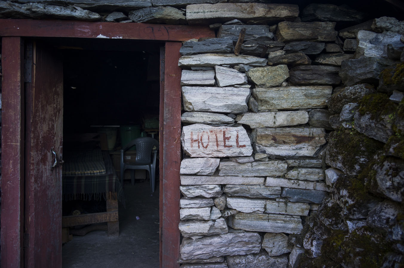 Wir erreichen unser drittes und letztes Teehaus des Tages; ein abgeschiedenes Steingebäude, in dem ein in orange gekleideter Pilger lebt. Der Baba schenkt uns Tee ein und spricht begeistert durch seinen langen, verfilzten Bart. Ich gehe davon aus, dass nicht viele Besucher hierher kommen und Mike vertraut mir an, dass nur 50 Prozent diesen Pindari-Trip zu Ende fahren. Die Hälfte seiner Kunden schaffen es nicht, manchmal wegen des Schnees, meistens wegen der mangelnden Fitness.