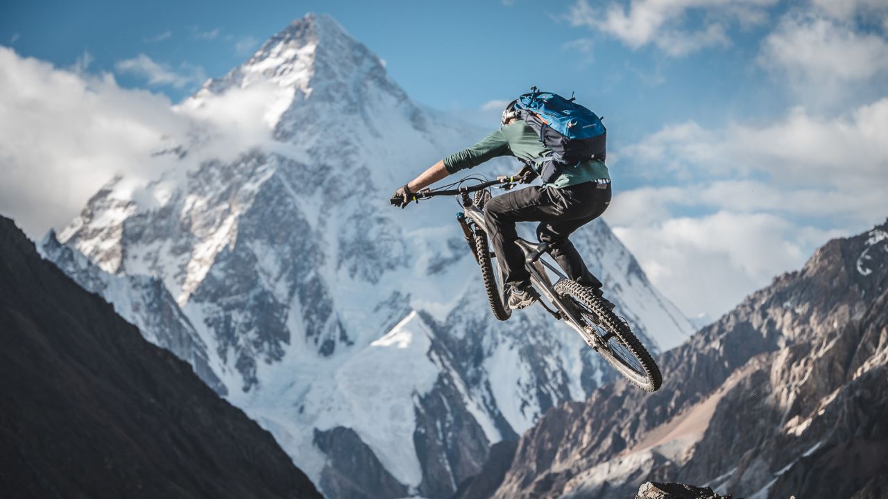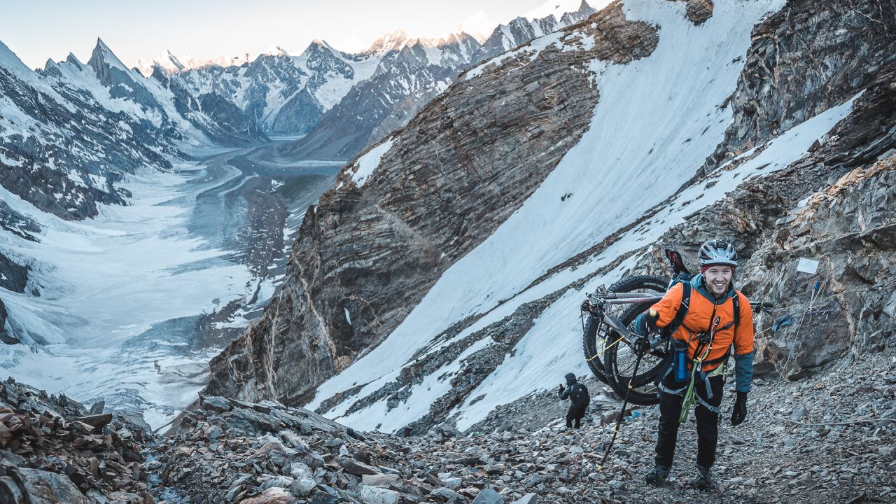 Pünktlich wie geplant, starteten wir dick eingepackt, begleitet von tausenden Sternen. Als wir die Bikes um Mitternacht auf die Rucksäcke luden hatte jeder über 20kg Gepäck. Wir stapften langsam und schwer atmend durch die Nacht. Außer unseren eigenen Geräuschen herrschte absolute Stille. Das Gelände wurde immer steiler. Bald war der Untergrund noch dazu vereist. Unsere Steigeisen kamen zum Einsatz. Kurz darauf erreichten wir die Fixseile. Wie ein Geländer schlängelten sie sich nach oben in die finstere Nacht. Wir waren erleichtert uns hier sichern zu können: Klettergurt anziehen, Steigklemme einhängen und weiter ging es. Schritt für Schritt. Langsam. Sehr langsam. Zwischendurch gab es senkrechte Abschnitte, welche wir ohne die Seile sicher nicht hätten überwinden können. Das Gewicht der Räder lastete schwer auf unseren Schultern. Es wurde immer anstrengender, doch wir zogen uns weiter hinauf. Die Zeit kam uns endlos vor, als der Horizont endlich aufhellte und das Gelände flacher wurde. Schließlich waren die ersten Bergsteiger und Träger im Abstieg und kamen uns entgegen. Fragwürdige Blicke trafen uns. Gegen 5 Uhr morgens erreichten wir völlig ausgelaugt die Passhöhe auf 5650m. Wir fielen uns in die Arme. Der „Gondogoro La“ erstreckte sich vor uns in seiner weißen Pracht. Wir hatten es wirklich geschafft! Die aufsteigende Sonne wurde kräftiger und wärmte unsere durchgefrorenen Körper. Wir gossen uns eine Tasse heißen Tee ein und genossen überwältigt die grandiose Aussicht. Vier der 14 Berge über 8000 Meter standen in strahlendem Weiß vor uns: Gasherbrum 1 & 2, Broad Peak und der K2.