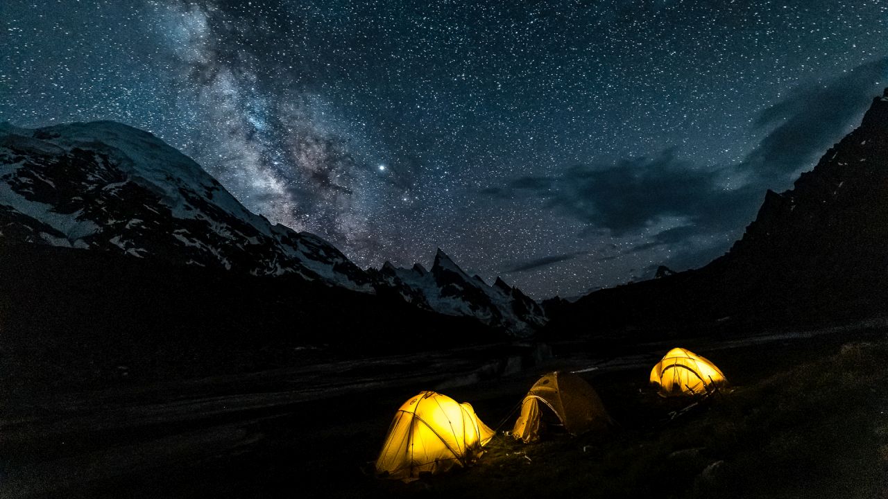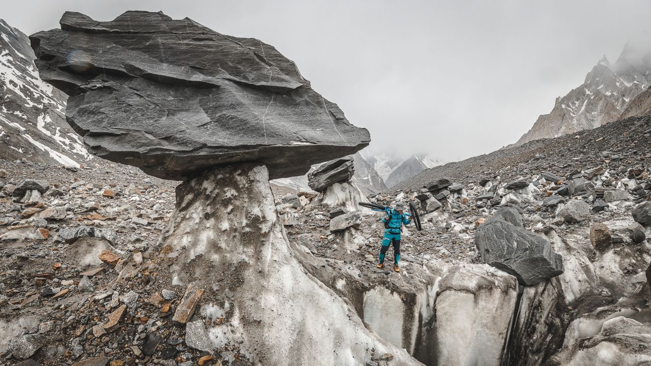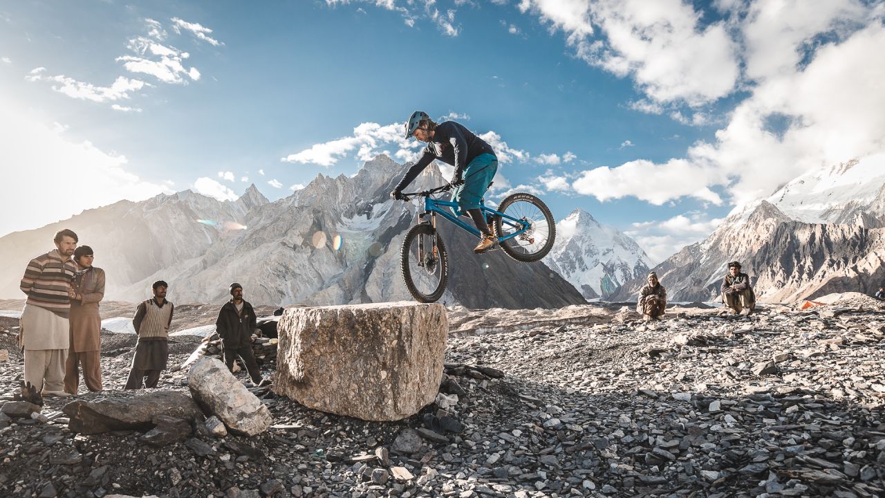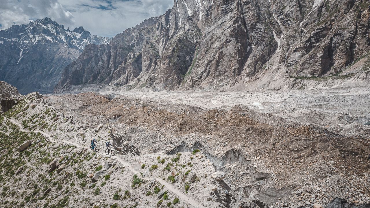 Im ersten Camp auf 3600m verbrachten wir zwei Nächte, um uns an die Höhe zu gewöhnen. So konnte auch Jakob weiter genesen. Tagsüber war es unerwartet heiß und die Luft extrem trocken. Selbst auf dieser Höhe gab es dichte Vegetation und sogar Bäume. Um der Hitze zu entgehen, starteten wir am dritten Tag bereits um 5.30Uhr morgens zu unserer nächsten Teilstrecke. An Fahren war hier nicht mehr zu denken. Wir legten die Bikes auf unsere Rucksäcke. Der Pfad führte zu Beginn steil auf eine Gletschermoräne hinauf. Oben wurde es flacher, wir konnten schieben, und arbeiteten uns Stück für Stück weiter empor. Vor uns ragte der 7800m hohe „Masherbrum“ in den strahlend blauen Himmel. Zu unserer Linken lag der schuttbedeckte Gletscher. Auf 4100m erreichten wir die bereits errichteten, leuchtend gelben Zelte und wurden herzlichst empfangen. Die Träger liefen um vieles schneller als wir, im Schnitt brauchten sie nur die Hälfte unserer Zeit. Die jungen Männer waren unglaublich fit, stets gut gelaunt und für jeden Scherz zu begeistern. Auch wenn sie praktisch kein Englisch sprachen, fanden wir immer einen Weg mit ihnen zu kommunizieren und Spaß zu haben. So auch an diesem Abend.