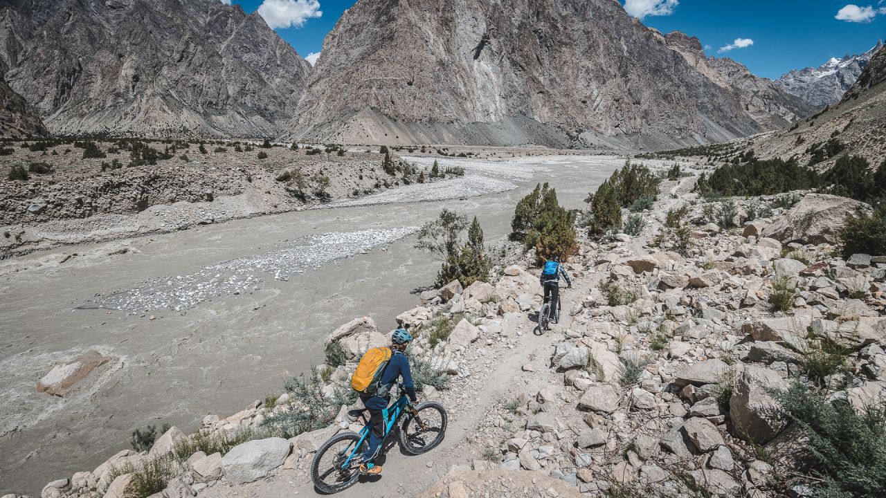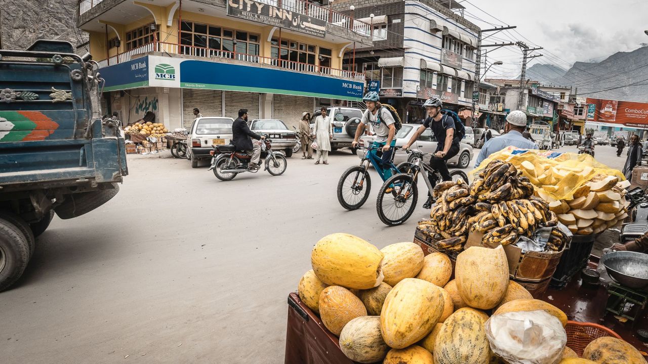 Jakob ging es am nächsten Morgen zum Glück besser und so konnten wir uns auf die erste Etappe unserer Expedition begeben. Bis zum höchsten Punkt unserer Tour, dem „Gondogor La“ mit 5650m, hatten wir von hier fünf Tage eingeplant. Das Hauptaugenmerk meiner Planung lag auf der Akklimatisation. Um erfolgreich über den Pass steigen zu können, mussten wir uns langsam an die Höhe anpassen und vor dem entscheidenden Tag topfit sein. Dementsprechend fuhren wir gemächlich aus dem Ort hinaus und genossen die ersten Meter auf unseren Rädern. Überraschenderweise war der Weg flach angelegt und teilweise sogar von Steinen befreit worden. So konnten wir viel Zeit im Sattel verbringen und bergauf radeln. Die Berge ragten steil wie Pfeilspitzen um uns in den Himmel. Wo wir auch hinblickten, mussten wir den Kopf in den Nacken legen, um die Gipfel der Granitriesen sehen zu können. Beeindruckend.