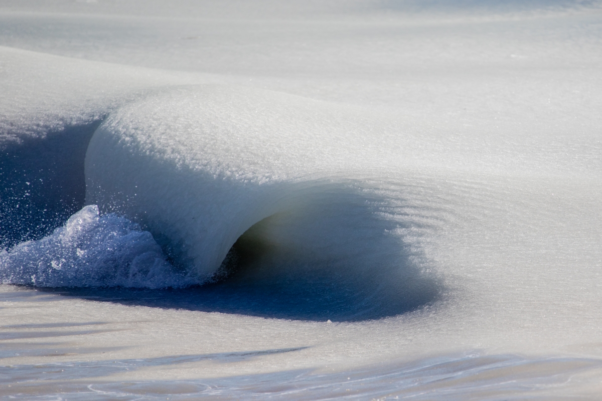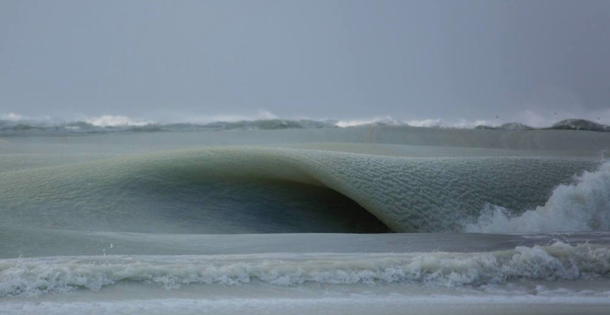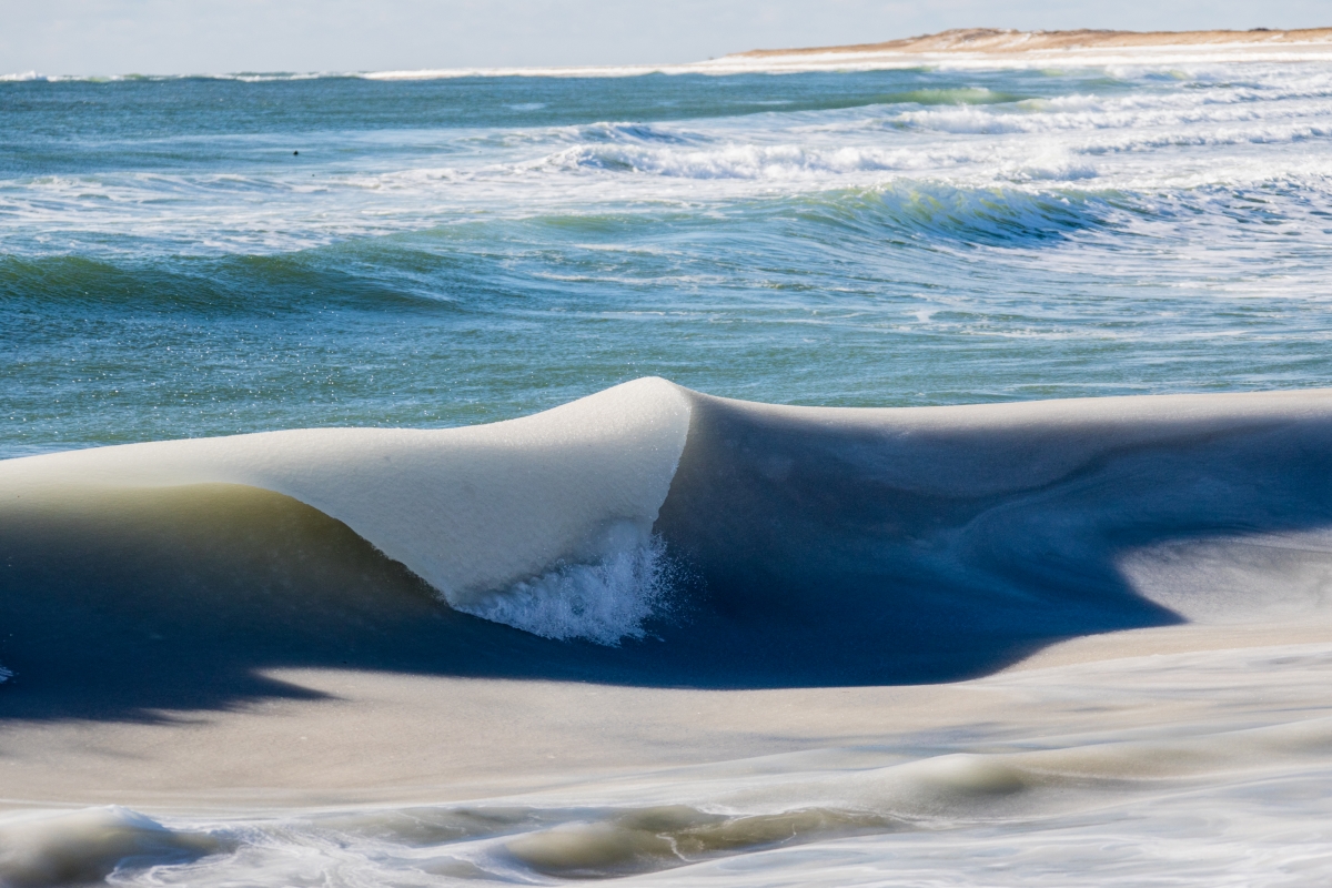 Als Jonathan Nimmerfroh an diesem Tag den Ozean erreichte, ahnte er direkt, dass seine Aufnahmen ein extrem seltenes Schauspiel einfangen würden. Der Fotograf aus Nantucket, eine etwa 125 Quadratkilometer große Insel des US-Bundesstaates Massachusetts, hielt auf seinen Bildern Eis-Wellen fest, die wie eingefroren wirken.
