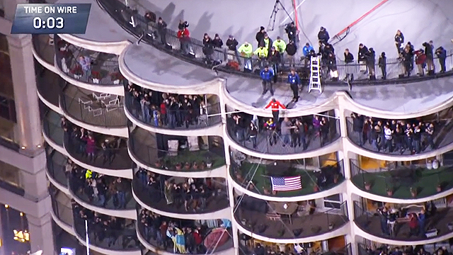 Nik Wallenda balanciert mit verbundenen Augen zwischen zwei Hochhäusern