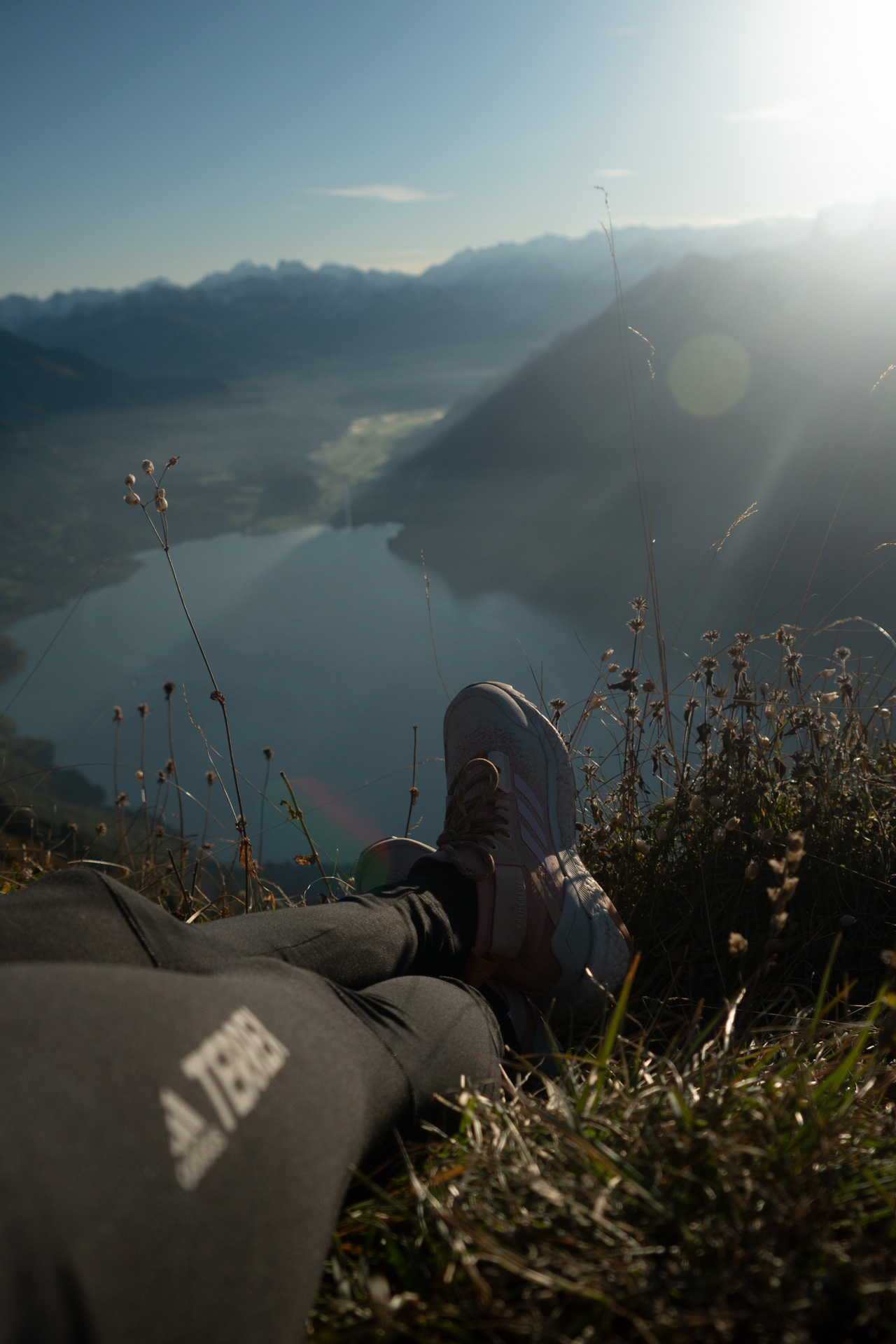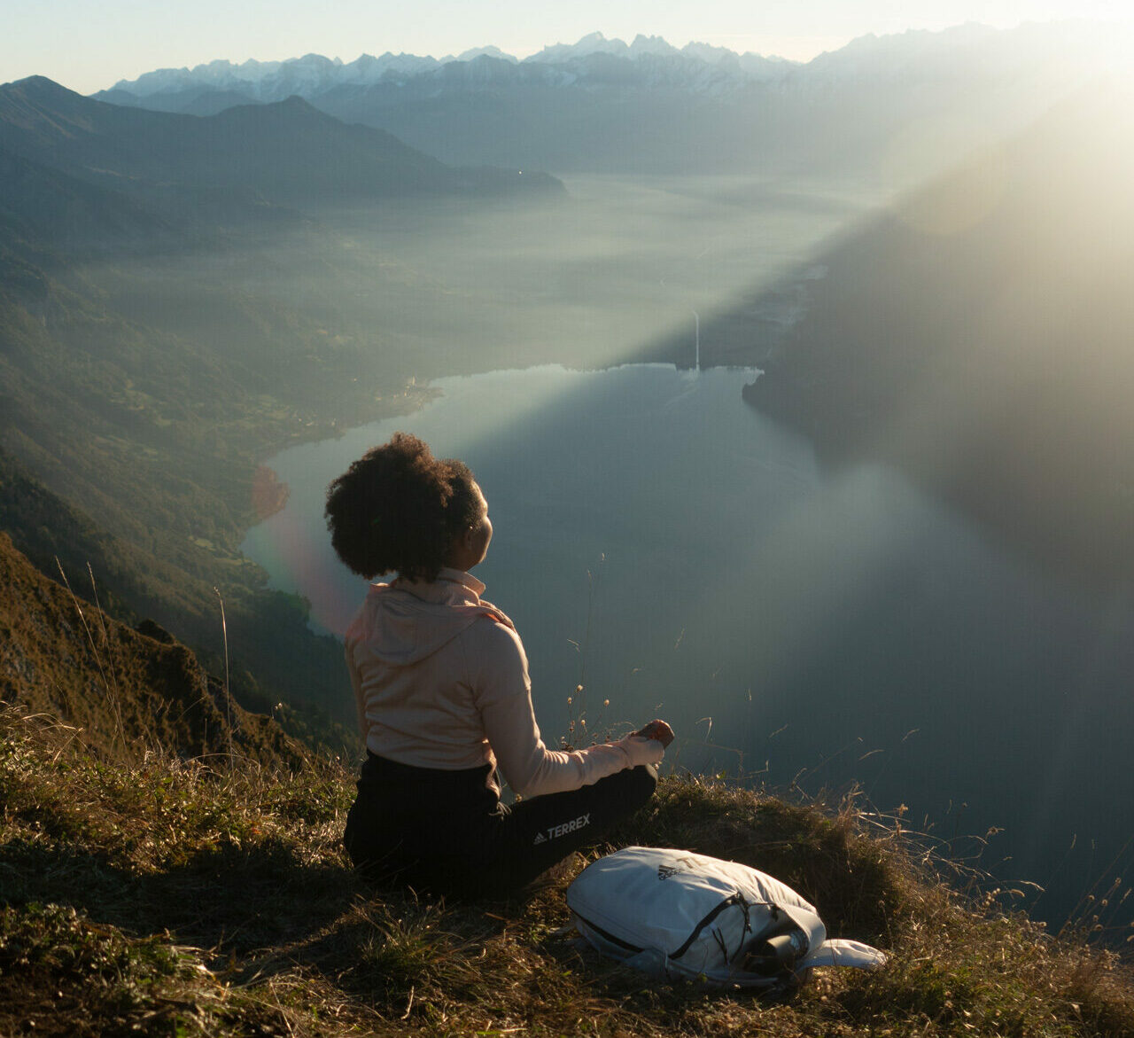 Es ist ihr tägliches Ritual, um den Geist zu beruhigen und sich der totalen Entspannung zu verschreiben. Während das erste Morgenlicht auf ihr Gesicht trifft, atmet sie tief ein und taucht ab. Sie fühlt sich ruhiger, negative Gedanken verflüchtigen sich beim Meditieren. Beth erkundet den Grat noch ein wenig weiter, legt regelmäßige Trinkpausen ein und genießt die unglaubliche 360-Grad-Aussicht auf die umliegenden Bergketten und den See im Tal. Nachdem sie die Eindrücke in sich aufgesogen hat, geht es wieder bergab zur Lombachalp. Mit höherem Sonnenstand wird der Weg beschwerlicher, der Boden weicht zusehends mehr auf.