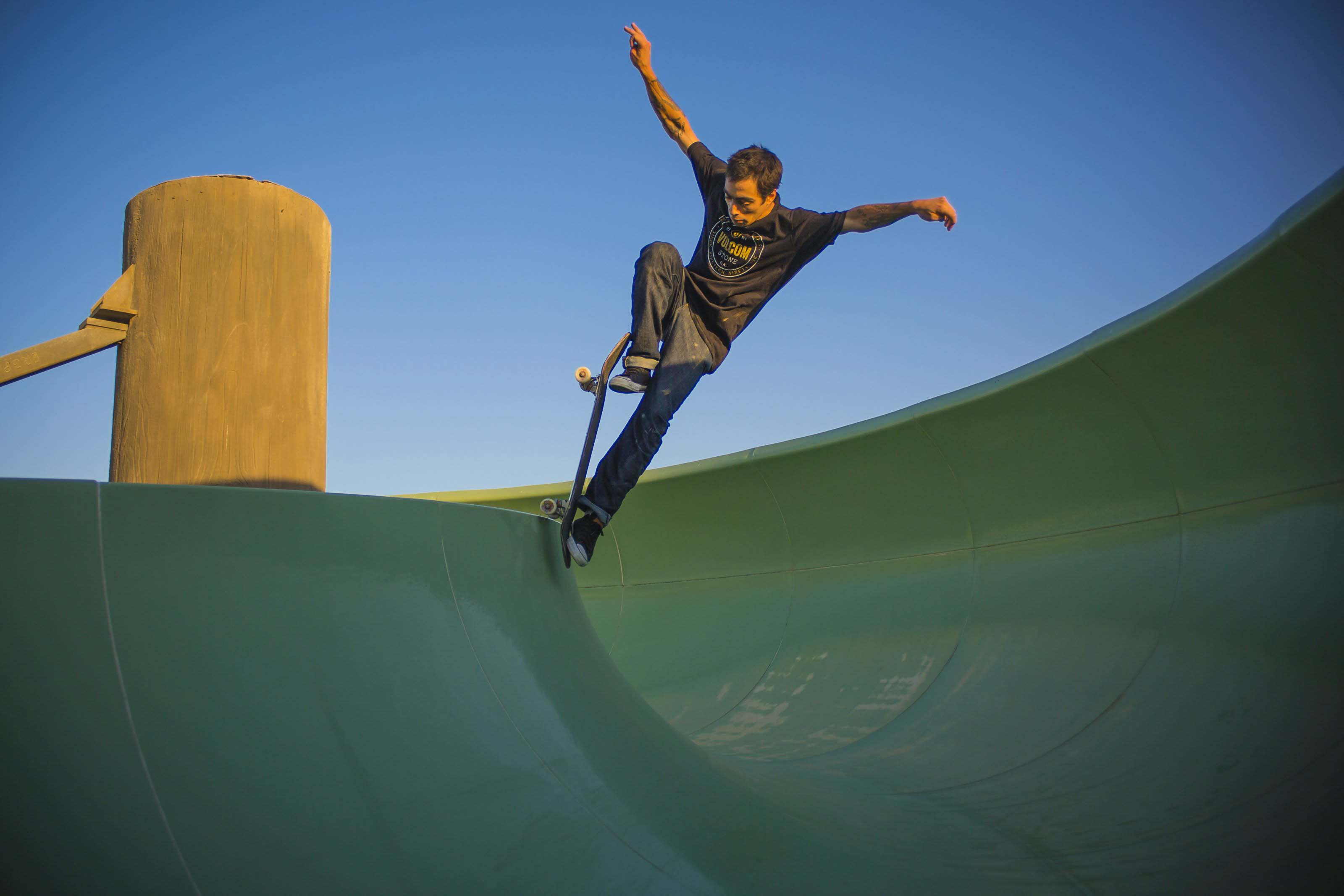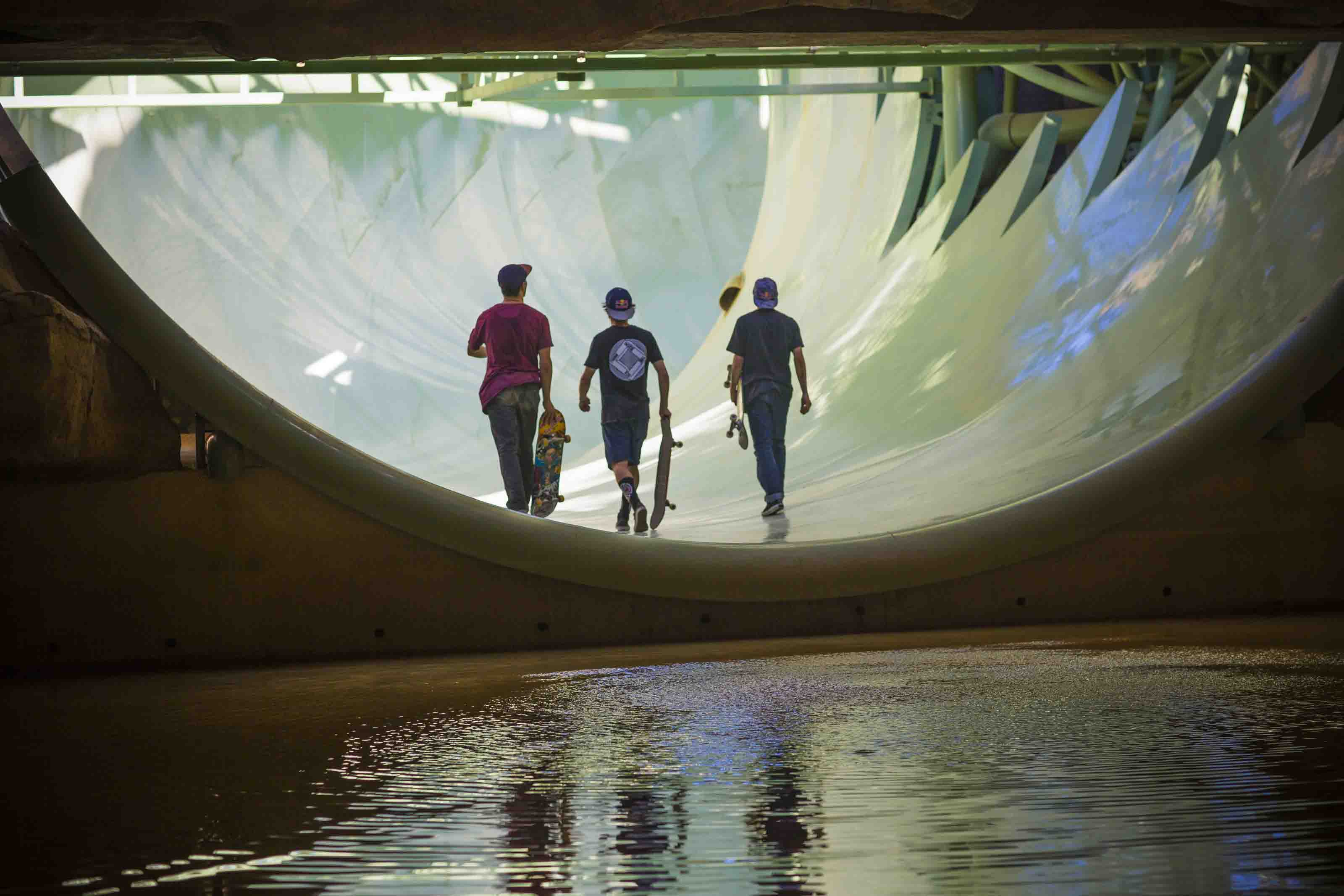 Eine 156 Meter lange Pipe sowie eine 14 Meter hohe Wall: Drei Skateboarder haben sich die Wartungsarbeiten im Aquaventure Waterpark von Dubai zunutze gemacht, um die trockengelegten Aquaconda- und Zoomerango- Wasserrutschen in einen einzigen großen Skateboard-Playground zu verwandeln.