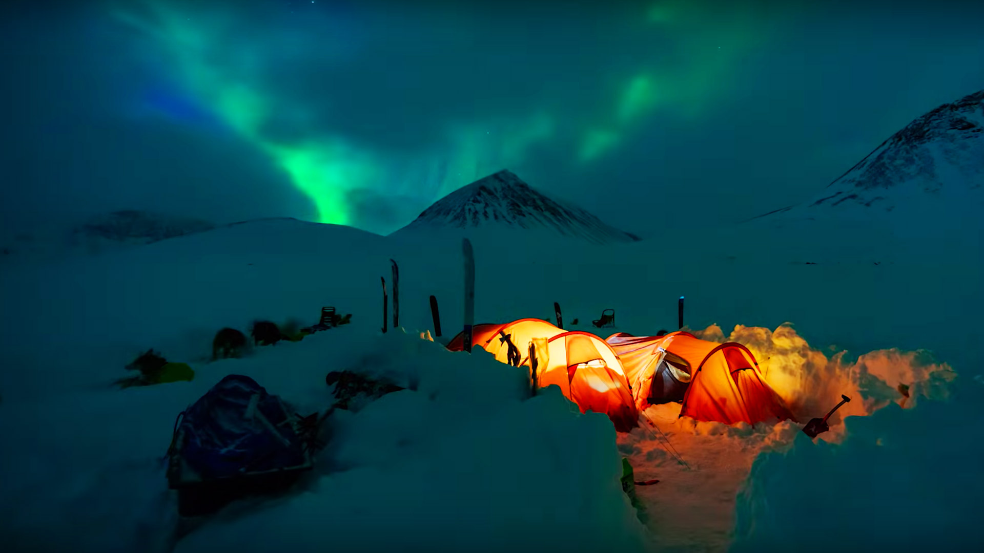 Sie fanden ihr Basecamp in einem ausgemusterten Eisenbahnwaggon, der mitten im Nirgendwo von den Gleisen genommen worden war. Die meisten Berge in diesem Teil Russlands haben noch nie Skifahrer gesehen. Nicht nur die unglaubliche Landschaft, die sich am besten als “arktische Wüste” beschreiben lässt, sondern auch die Menschen, die sie an diesem kalten und abgelegenen Ort trafen, machten diese Reise für alle einzigartig. “Druschba” bedeutet Freundschaft, und der Begriff wurde während ihrer Zeit mit sechs russischen Schneemobilfahrern häufig genutzt.