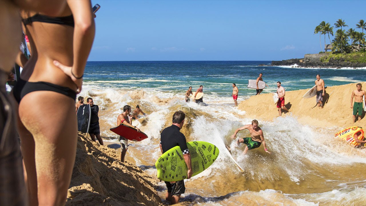 Der Kleine hier im Video heißt Steve Robertson und beeindruckt uns mit seinem Mut, es am Neujahrstag in der Honolua Bay von Maui mit dieser Tube aufgenommen zu haben; vor ihm in der Welle sieht man noch eine Schildkröte durch die Welle tauchen, die selbst etwas spät dran zu sein scheint. Zwar macht die Welle auch für Steve die Tür zu, aber seine Reaktion im Anschluss lässt uns mit einem Grinsen zurück.