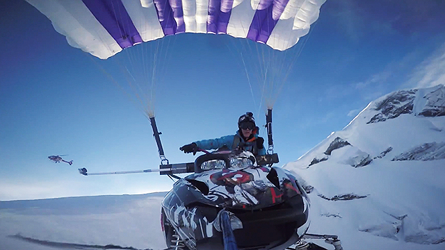 Extremsportler Antti Pendikainen bindet sein Snowmobile an einen Fallschirm und fliegt davon!