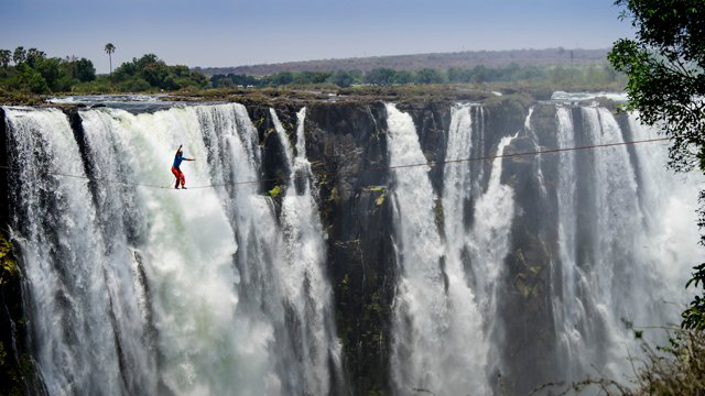 In knapp 90 Metern Höhe über dem Wasserfall sorgen zwei Extremsportler für Furore