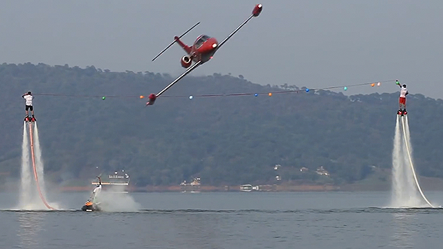 Knapper Stunt : Dieser Jet fliegt zwischen zwei Flyboardern durch