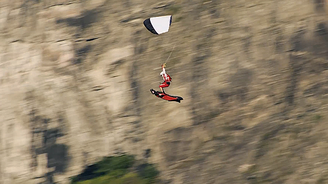 Unfassbar: Dieser Fallschirmspringer surft auf dem Wingsuit eines Basejumpers
