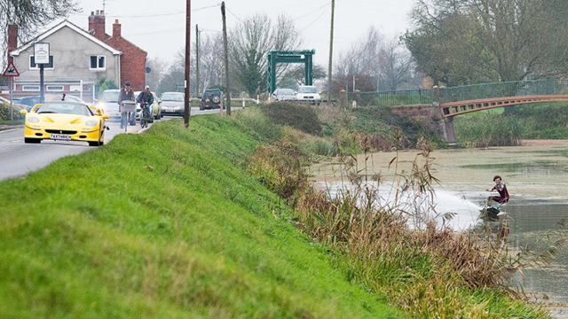 Wakeboard-Profi Jorge Gill spannt sich mit dem Wakeboard hinter einen Ferrari F50